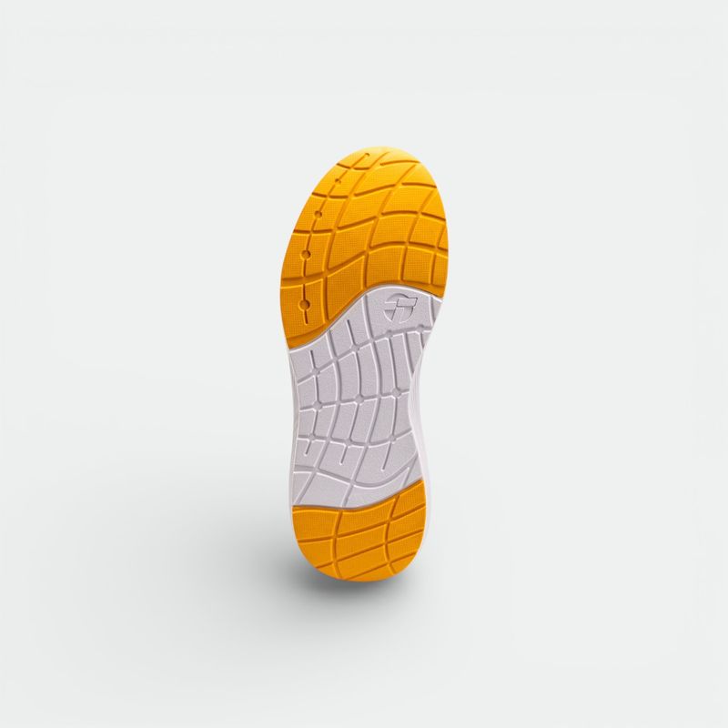 Suela: Suela de goma con inserciones en color naranja, diseñada con un patrón de agarre que mejora la tracción en superficies de asfalto.