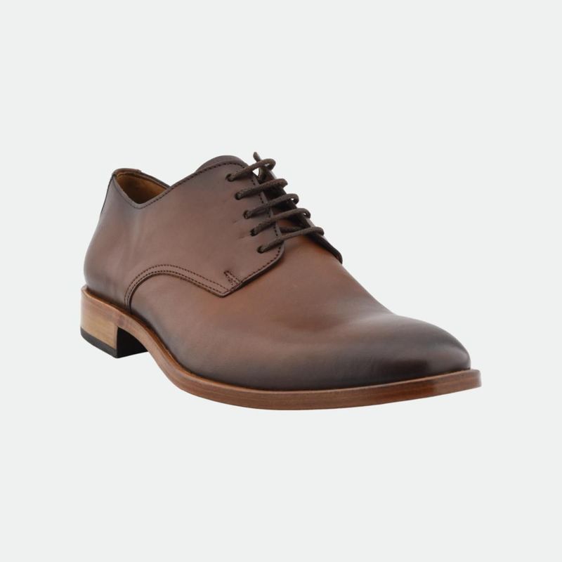 Zapato de vestir, acordonado, horma cuadrada de gran calce. Esta íntegramente confeccionado con cuero vacuno liso en la puntera y en la capellada, forrado también en vacuno. La suela es de cuero original con vira montada sobre la misma.